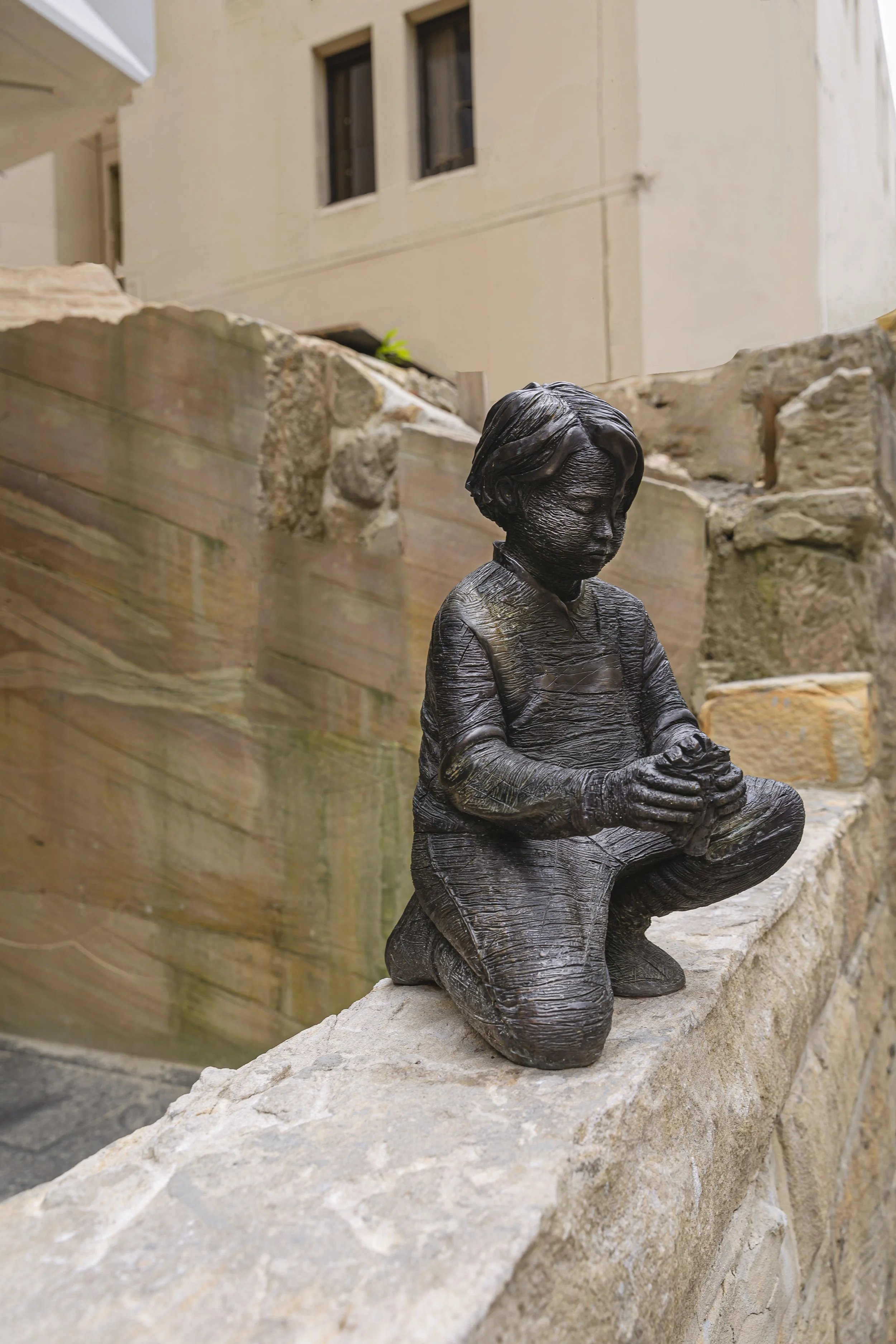 Metal patinas which have been used throughout the bronze canon, reflect colours which can also be found here in the sandstone wall. This reciprocal, historical and textural relationship between traditional materials speaks to the history of art in the public realm and the transformation of natural materials through human endeavour. The convergence of these materials will increase over time as the bronze ages with the wall.