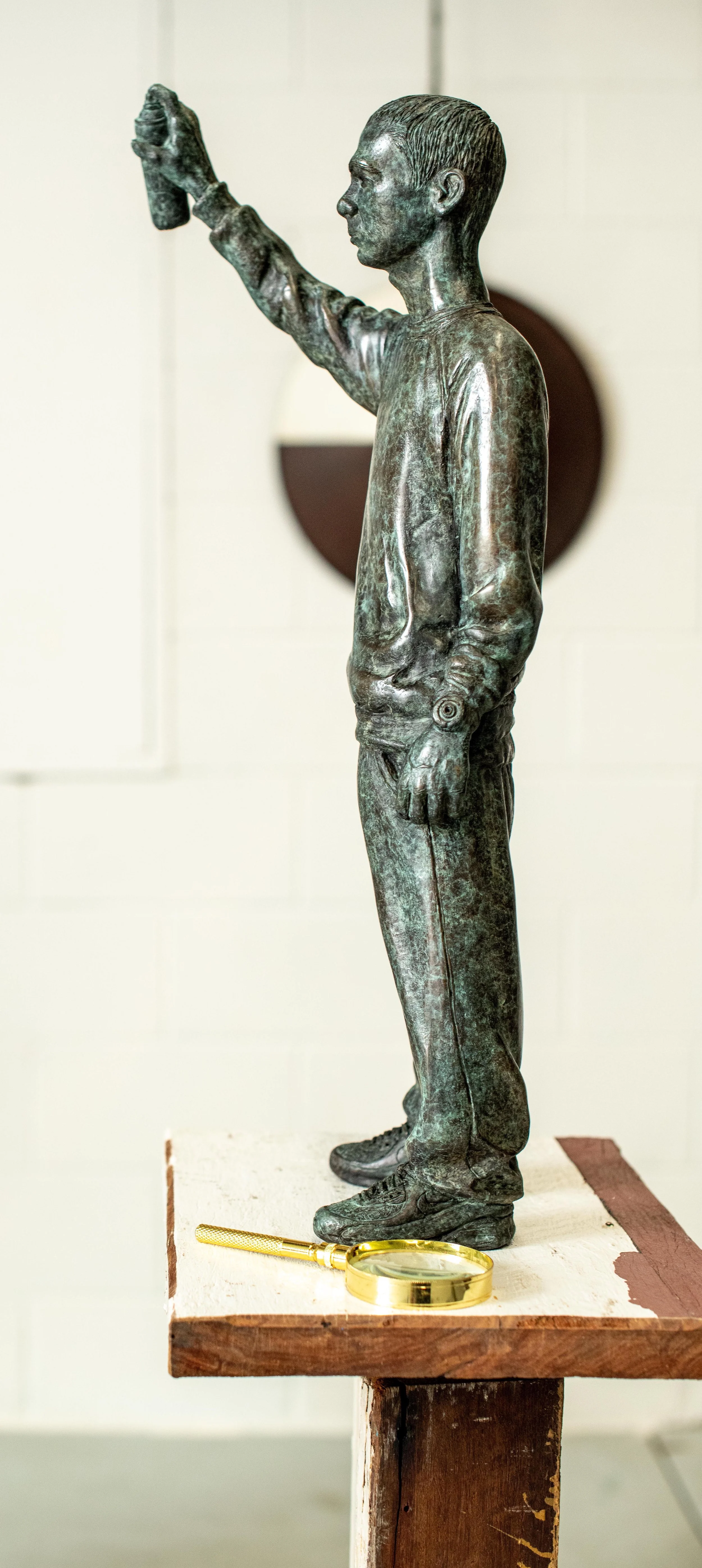 Leonie wanted to cast this popular, yet contentious modern icon. The work joyfully juxtaposes ancient materials with a quintessentially contemporary subject. Leonie attenuated the folds on the tracksuit to echo the drapery of 'The Writer's' classical predecessors. This piece explores what it means to be an artist in the new century.